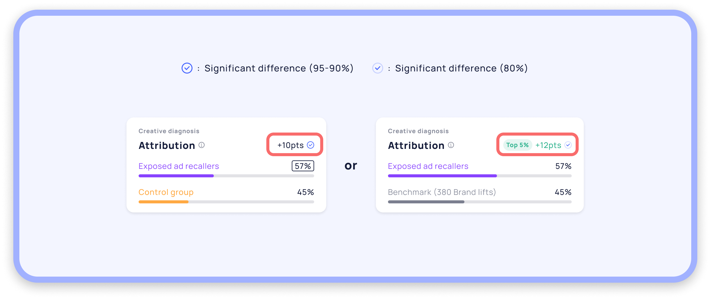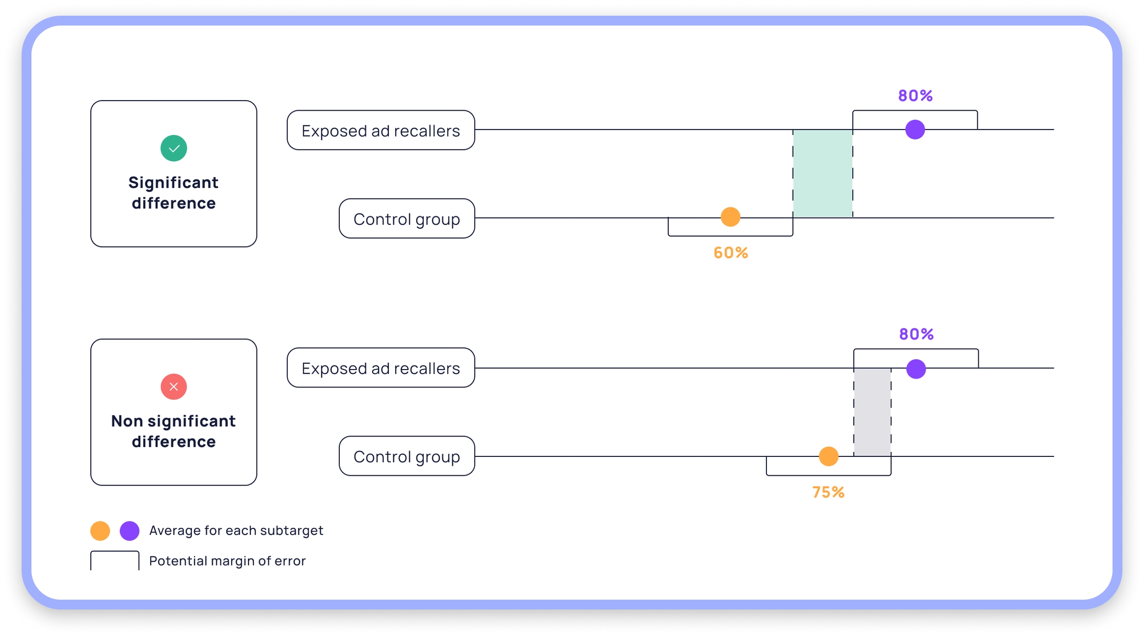 This uplift can be higher or lower. A 10-point and a 30-point difference will not have the same impact. However, the scale of the gap not only depends on the selected indicator, but also on your campaign's media and industry. To determine whether an uplift is acceptable, you need to refer to the uplift benchmark, available in the "Impact" section of the advertising recall.